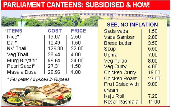 संसद की कैंटीन को सालाना करीब 17 करोड़ रुपए की सब्सिडी दी जा रही थी, जो अब खत्म हो जाएगी। कैंटीन की रेट लिस्ट में चिकन करी 50 रुपए में तो वहीं वेज थाली 35 रुपए में परोसी जाती है। थ्री कोर्स लंच की कीमत 106 रुपए निर्धारित है। साउथ इंडियन फूड श्रेणी का प्लेन डोसा मात्र 12 रुपए में मिलता है। उक्त रेट लिस्ट एक आरटीआई के जवाब में 2017-18 में यह रेट लिस्ट सामने आई थी।