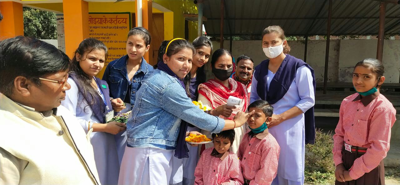 फतेहगंज प्राइमरी स्कूल में कोविड-19 के बाद प्रथम दिन स्कूल खुलने से बच्चों के आगमन पर सरदार भगत सिंह कॉलेज ऑफ साइंस की बालिकाओं ने किया बच्चों का टॉफी खिलाकर और चंदन लगाकर स्वागत किया।
