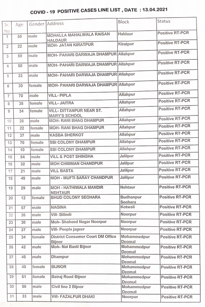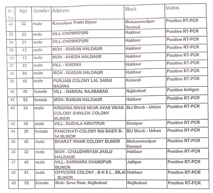 बिजनौर। जनपद में कोरोना संक्रमित लोगों की संख्या में 49 की वृद्धि हुई है। मंगलवार को सीएमओ कार्यालय से प्राप्त जानकारी के अनुसार आज 1975 टेस्ट रिपोर्ट प्राप्त हुईं। इनमें से 1926 निगेटिव पाए गए, जबकि 49 में कोविड-19 के लक्षणों की पुष्टि हुई है। इस बीच जिला प्रशासन ने कोरोना को लेकर जारी गाइड लाइन का पालन सख्ती से कराने के निर्देश पुलिस विभाग को दिए हैं। मास्क बिना पहने घूमने वाले लोगों से जुर्माना वसूलने के साथ ही बिना वजह घूमने वालों से सख्ती से निपटा जाएगा। लोगों से सोशल डिस्टेंस का पालन करने, सेनेटाइजर का प्रयोग करने की अपील भी की जा रही है। वहीं सेनेटाइजिंग के लिए अग्नि शमन विभाग की गाड़ियों का प्रयोग भी किया जाएगा।