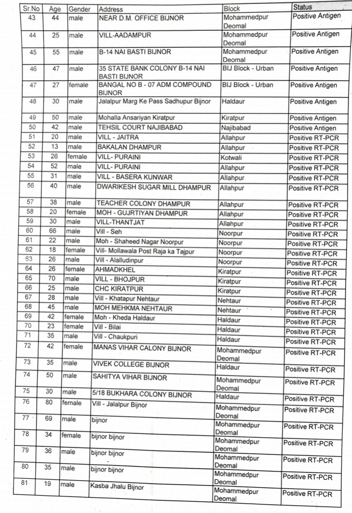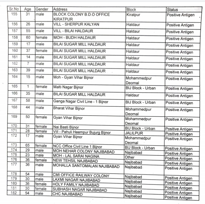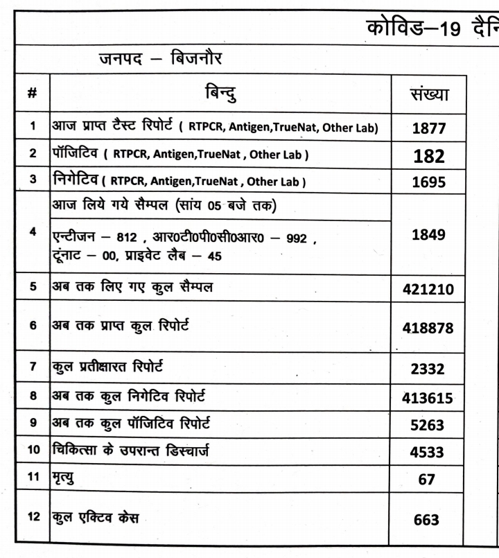 बिजनौर मे गुरुवार को आए अब तक के सर्वाधिक 182 कोरोना पॉजिटिव मामले, बुधवार को यह संख्या 102 थी। एक्टिव केस की संख्या 663 हो गई है।