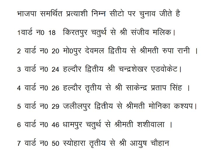 भाजपा समर्थित प्रत्याशी निम्न सीट पर चुनाव जीते हैं- वार्ड 18 किरतपुर चतुर्थ से संजीव मलिक, वार्ड 20 मोहम्मदपुर देवमल द्वितीय से श्रीमती रुपा रानी, वार्ड 24 हल्दौर द्वितीय से चन्द्रशेखर एडवोकेट, वार्ड 26 हल्दौर तृतीय से पूर्व जिला पंचायत अध्यक्ष साकेन्द्र प्रताप सिंह, वार्ड 29 जलीलपुर द्वितीय से श्रीमती मोनिका कश्यप, वार्ड 46 धामपुर चतुर्थ से श्रीमती शशीबाला तथा वार्ड 50 स्योहारा तृतीय से आयुष चौहान ने विजय प्राप्त की है।