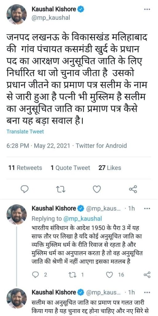 वहीं मोहनलाल गंज सांसद कौशल किशोर ने भी प्रदेश के मुख्यमंत्री से ट्विटर के माध्यम के सलीम का जाति प्रमाणपत्र गलत जारी होने से ग्राम पंचायत कसमंडी खुर्द का चुनाव रद करके नए सिरे से ग्राम प्रधान का चुनाव कराने का अनुरोध किया है।