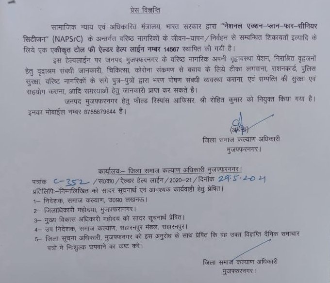 मुजफ्फरनगर। सामाजिक न्याय एवं अधिकारित मंत्रालय, भारत सरकार द्वारा “नेशनल एक्शन प्लान फार-सीनियर सिटीजन (NAPSrC) के अन्तर्गत वरिष्ठ नागरिकों के जीवन-यापन / निर्वहन से सम्बन्धित शिकायतों इत्यादि के लिये एक एकीकृत टोल फ्री ऐल्डर हेल्प लाईन नम्बर 14567 स्थापित की गयी है।