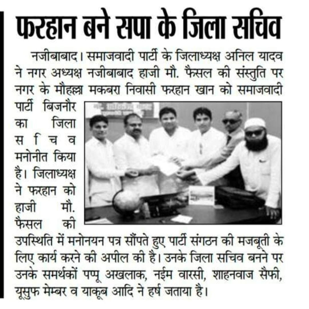 जिला अध्यक्ष समाजवादी पार्टी जनपद बिजनौर राशिद हुसैन का कहना है कि सोशल मीडिया से ज्ञात हुआ है कि नजीबाबाद में किसी विवाद को लेकर फरहान ने अपनी एक वीडियो बनाकर बयान जारी किया है। वीडियो में अभद्र भाषा का प्रयोग किया है। स्पष्ट है कि यह बयान नौसीखिए का लग रहा है। ऐसे बयानों से अप्रिय घटना हो सकती है। इस व्यक्ति से समाजवादी पार्टी का कोई लेना देना नहीं है और न यह पार्टी के किसी पद पर है। समाजवादी पार्टी कानून का पालन करती है और हिंदू मुस्लिम एकता पर काम करती है। उन्होंने सभी जनपदवासियों से अपील करते हुए कहा कि ऐसे लोगों से दूरी बनाकर रखें। जिससे जिले का माहौल खराब न हो पाए।