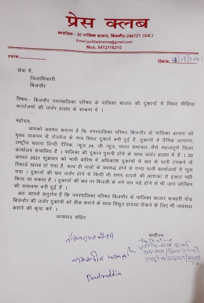 बिजनौर। लगातार ख़तरों से खेलते हुए आम और खास जनमानस को पल-पल की खबरों से रूबरू कराने वाले मीडियाकर्मी अब अपने ही कार्यालयों में सुरक्षित नहीं रह गए हैं। वजह?…पालिका बाजार की प्रेस गैलरी में संचालित कई मीडिया संस्थानों के कार्यालय भवन जर्जर हो गए हैं। हाल ही में हुई बरसात के बाद अधिकांश परिसर पानी में डूब गए। रही सही कसर सफ़ाई न होने से अवरुद्ध नालों के गंदे पानी ने पूरी कर दी। प्रेस क्लब के जिलाध्यक्ष के नेतृत्व में मीडिया कर्मियों ने जिलाधिकारी को लिखित शिकायत की है।