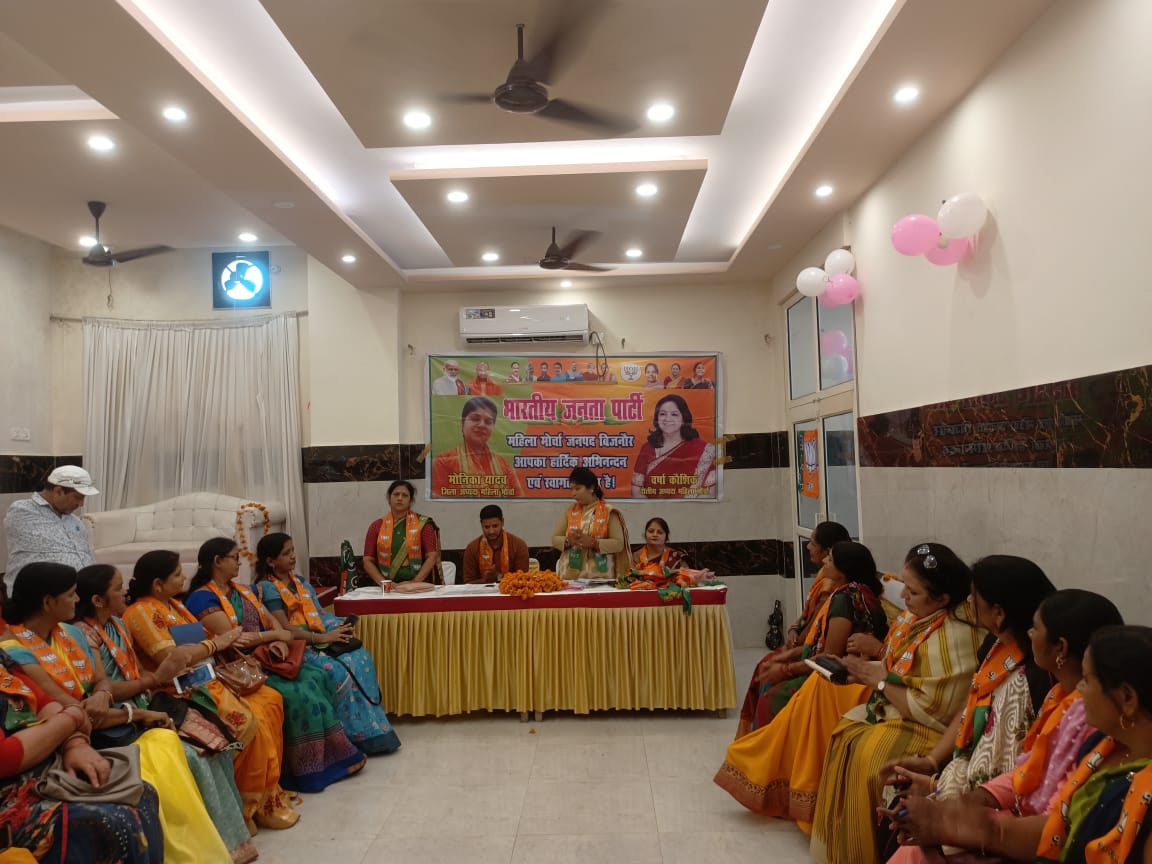 भारतीय जनता पार्टी महिला मोर्चा की परिचय बैठक का आयोजन हॉट एंड स्पाइसी होटल बिजनौर में किया गया। इस अवसर पर महिला मोर्चा की जिला पदाधिकारियों की बैठक हुई। कार्यक्रम का संचालन जिला महामंत्री भारती गौड़ ने किया और अध्यक्षता जिला अध्यक्ष मोनिका यादव ने की।