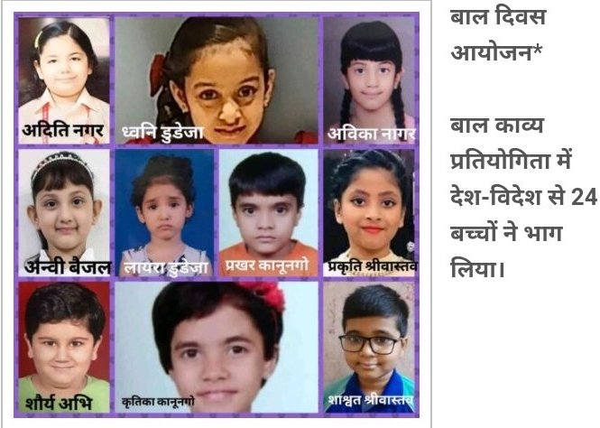 नई दिल्ली। काव्य मंजरी साहित्यिक_मंच (रजि०) द्वारा बाल दिवस पर आयोजित अंतर्राष्ट्रीय स्तर पर हुई बाल काव्य प्रतियोगिता में देश-विदेश से 24 बच्चों ने भाग लिया। प्रतियोगिता का उद्देश्य था बच्चों की प्रतिभा को निखारने का, उनके अंदर की योग्यता को सबके सामने लाने का और उनको एक ऐसा मंच देने का, जिससे उनको एक नया अनुभव व पहचान मिले।