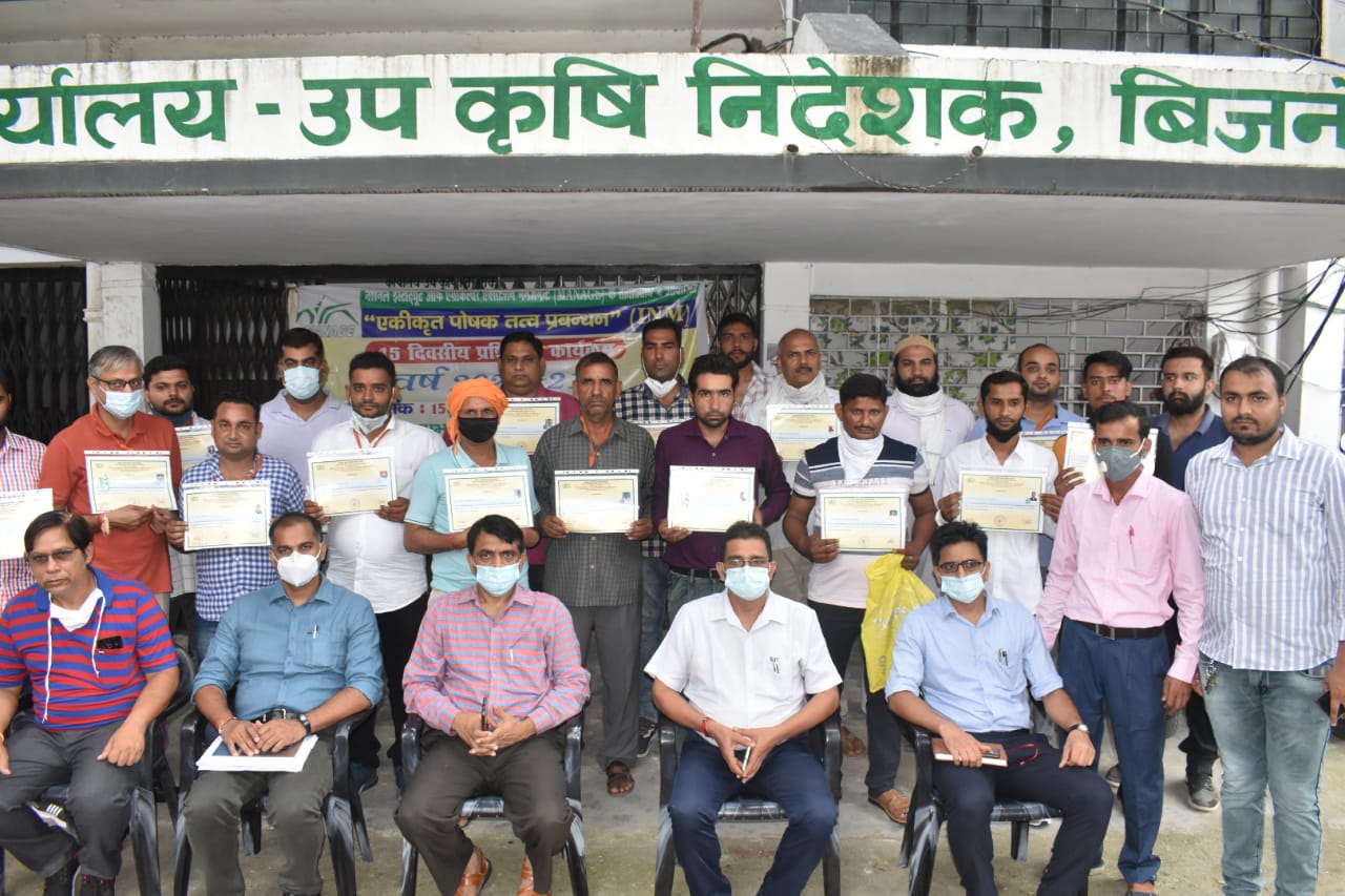 इससे पूर्व एकीकृत पोषक तत्व प्रबंधन का डिप्लोमा पूर्ण कर चुके प्रथम बैच के इनपुट डीलर्स को प्रमाण पत्र वितरित किए गए। धामपुर के विवेक अग्रवाल ने इस डिप्लोमा कार्यक्रम में 87% अंक लेकर प्रथम स्थान हासिल किया। अफज़लगढ़ के शुभम तोमर 77 प्रतिशत के साथ द्वितीय, बिजनौर के संजय राजपूत 75 प्रतिशत के साथ तृतीय व बास्टा के नितीन तयाल 74 प्रतिशत अंक प्राप्त कर चतुर्थ स्थान पर रहे। सभी इनपुट डीलर्स को उप कृषि निदेशक गिरीश चंद जिला कृषि अधिकारी डॉ. अवधेश मिश्र उप संभागीय कृषि प्रसार अधिकारी मनोज रावत, विषय वस्तु विशेषज्ञ व आत्मा प्रभारी योगेंद्र पाल सिंह योगी द्वारा संयुक्त रूप से प्रमाण पत्र वितरित किए गए। इनपुट डीलर्स का यह विशेष डिप्लोमा उन उर्वरक विक्रेताओं के लिए चलाया जाता है, जिनके पास लाइसेंस उर्वरक प्राधिकार प्राप्त करने की न्यूनतम योग्यता नहीं है। जनपद में 30 इनपुट डीलर्स का प्रथम बैच 15 मार्च 2021 से 31 मार्च 2021 तक चलाया गया था। परिणाम जून माह में मैनेज द्वारा घोषित किए गए। इनपुट डीलर्स को प्रमाण पत्र कोरोना महामारी के चलते वितरित नहीं किए गए जा सके थे। आज के कार्यक्रम को सफल बनाने में रजत चौधरी व फैसिलेटर चेतन स्वरूप का सहयोग रहा।